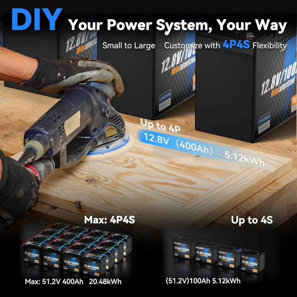 - 【Expandable and Durable Design】This high-capacity LiFePO4 battery supports series and parallel connections up to 4S4P, allowing for a maximum capacity of 20.48kWh.With an IP67 waterproof casing and robust construction, it's perfect for outdoor, marine, and off-grid use, ensuring long-lasting durability in challenging conditions. Attention: The 100ah LiFePO4 battery is intended for use as an energy storage purpose, Please do not use this battery as starting batteries. We do not suggest using it to start any device!