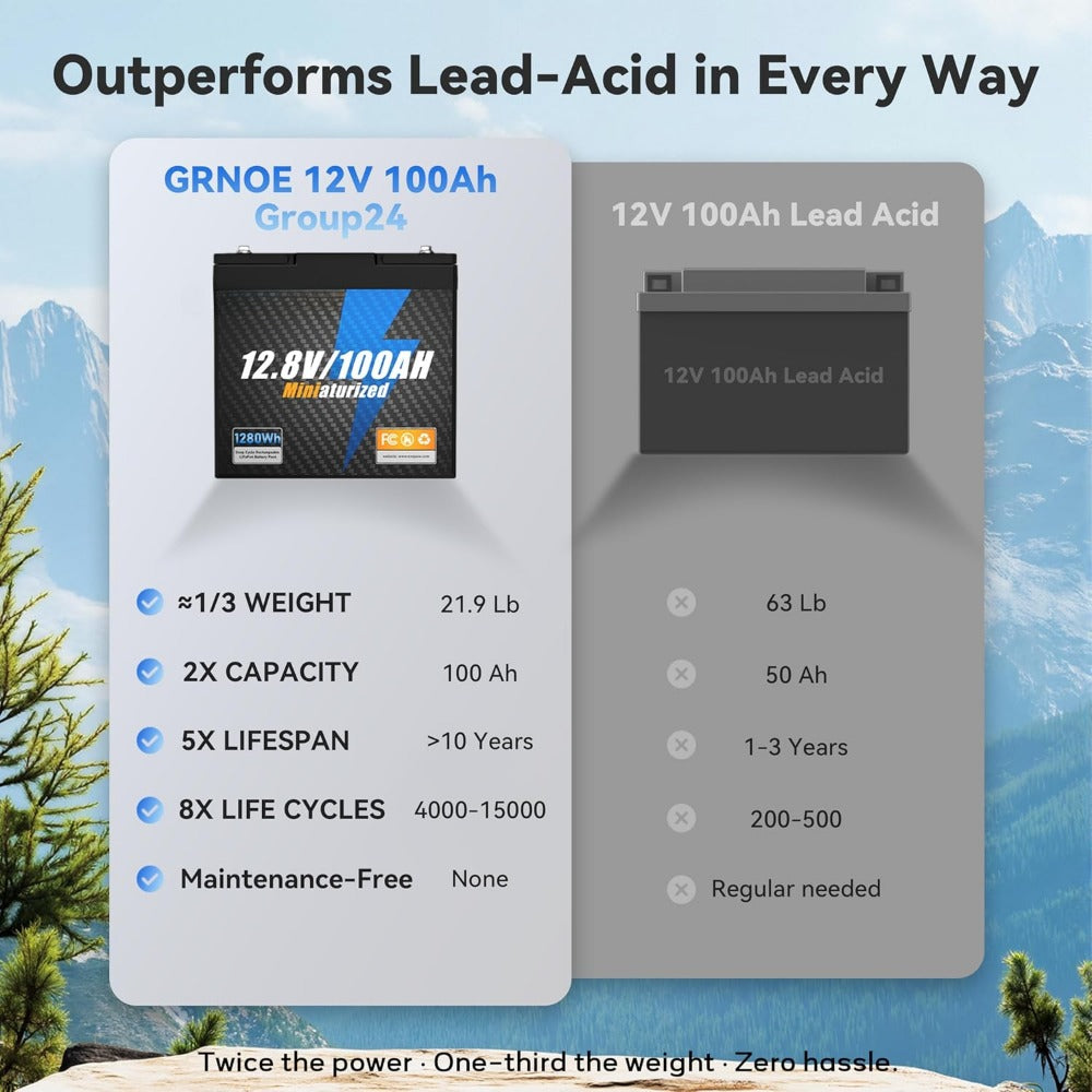 - 【Universal Fit, Fits BCI Group 24/27/31/49】12V 100Ah LiFePO4 Battery is mini size but large capcity, allowing it to function effectively in a variety of vehicles and applications. It is globally compatible with the Group 24/27/31/49 battery box . It is a perfect replacement for lead-acid and AGM, SLA batteries, no maintenance or complicated operation or wiring is required.